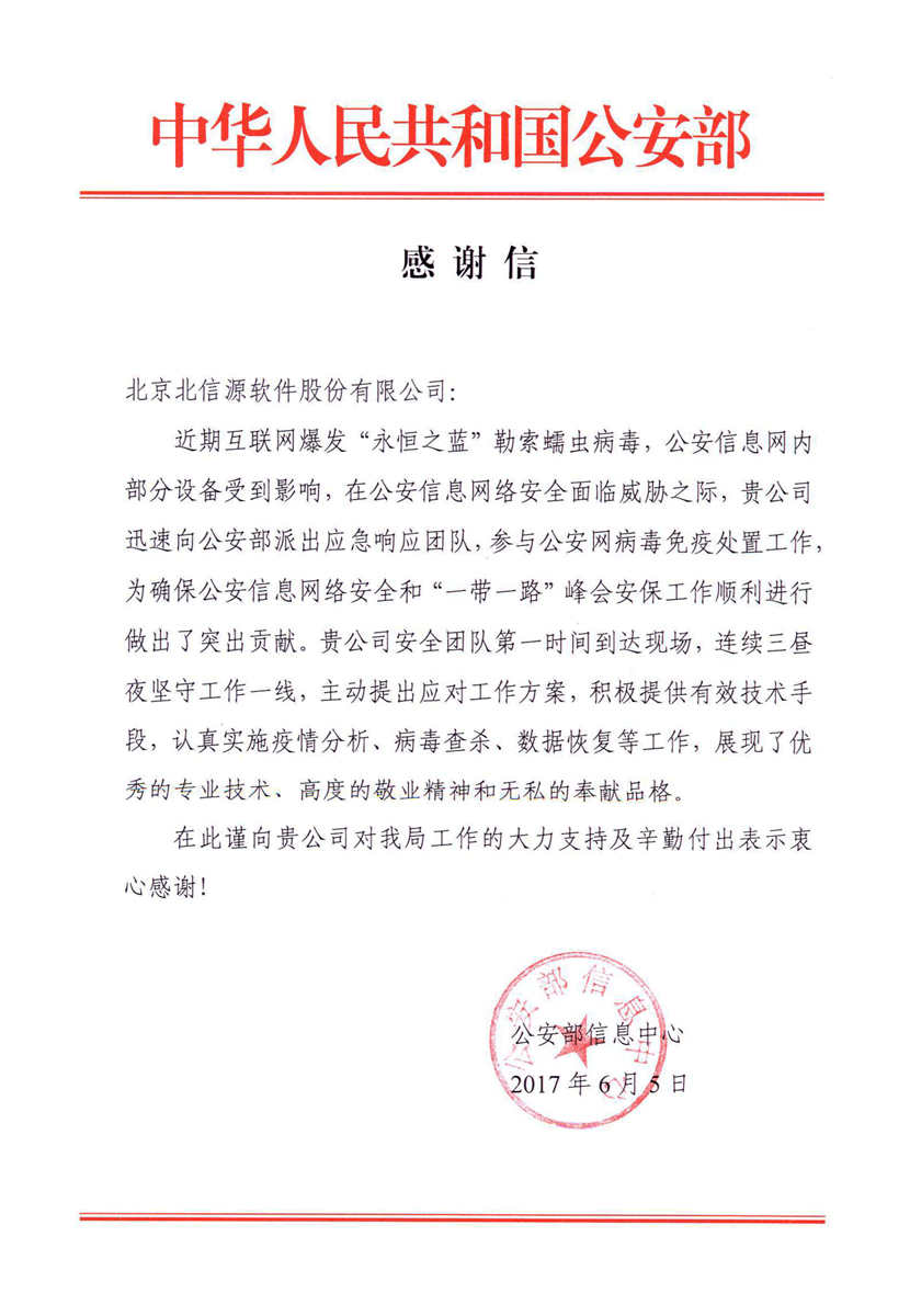 五月席卷全球的勒索病毒攻擊事態漸息,截至目前,北信源已陸續收到公安部以及陜西、河南、江蘇、福建、浙江、甘肅、黑龍江、北京、深圳、武漢、蘇州、寧夏、內蒙古在內的二十多個省市、自治區、直轄市公安系統發來的感謝信函!各方均對北信源在應對勒索病毒事件過程中展現出的專業能力與服務意識給予了高度認可與由衷感謝!