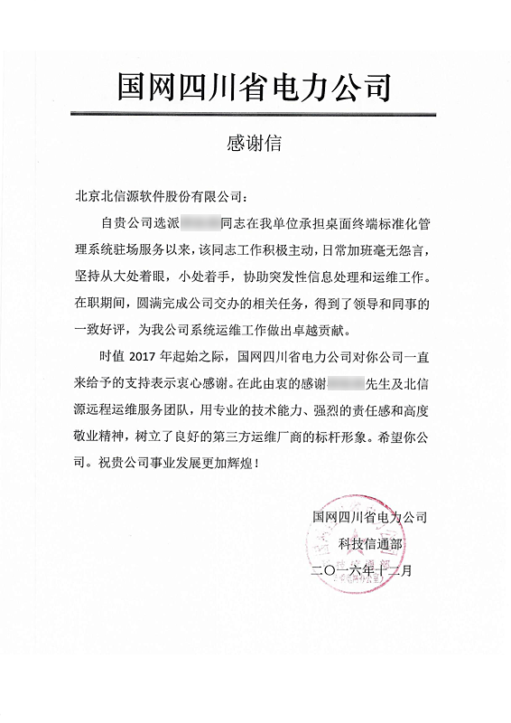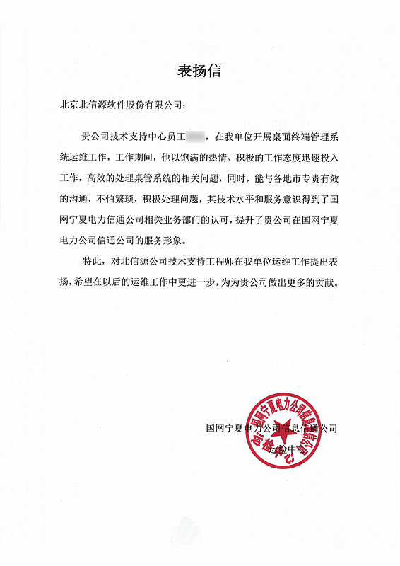 信中表示,北信源技術(shù)支持員工在桌管系統(tǒng)的日常運(yùn)維服務(wù)工作中,以飽滿的熱情、專業(yè)的技術(shù)和積極的態(tài)度幫助客戶及時(shí)、高效處理各類問題,并堅(jiān)持從大處著眼、小處著手的工作原則,對(duì)繁瑣的工作內(nèi)容和加班等情況毫無怨言,圓滿完成了各自的工作任務(wù),履行了對(duì)客戶的承諾,為北信源樹立起良好的第三方運(yùn)維廠商標(biāo)桿形象!