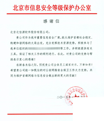 ——摘自北京市信息安全等級保護辦公室2015年初向北信源公司發來的《感謝信》。