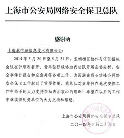 信中提到,2014年5月20日至5月21日,亞洲相互協(xié)作與信任措施會議在滬順利召開。貴單位積極協(xié)助我總隊開展態(tài)勢分析,安全事件日報告和應(yīng)急處理等各項工作,為圓滿完成亞信峰會網(wǎng)絡(luò)安全保衛(wèi)工作起到了重要作用。我總隊對貴單位在此次安保工作中給予的大力支持和幫助表示市衷心的感謝!希望在以后的工作中繼續(xù)得到貴單位的大力支持和幫助。