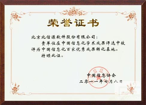 中國信息協會主辦“中國信息化成果評選”活動,每3-5年評選一次。 評選活動十分嚴謹,評審委員會均由來自國內權威的信息化研究機構和知名高等院校的專家組成,評選工作嚴格按照公平、公正的原則進行,評選出信息化“十大專著”、“十大學術推進人物”、“百篇優秀論文”、“百名優秀學術帶頭人”、“百家優秀學術研究管理機構”和“百家優秀學術成果轉化基地”等六個權威獎項。評選經過申報、資料提交、初評、復評,最后在中國信息界學術大會上公布評選結果并頒獎。