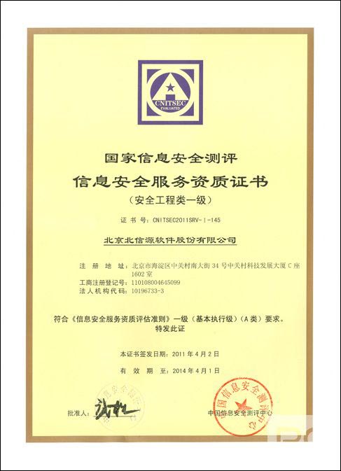 近日,北信源公司經過前期嚴格審核,正式取得信息安全服務資質證書。這一重要資質的取得,表明北信源公司作為信息安全服務的提供商,在服務能力、產品技術、資源、法律、管理等方面的資質、能力、穩定性和可靠性等方面均符合《信息安全工程服務一級資質具體要求》的規定,并能夠為客戶提供高標準的安全服務。