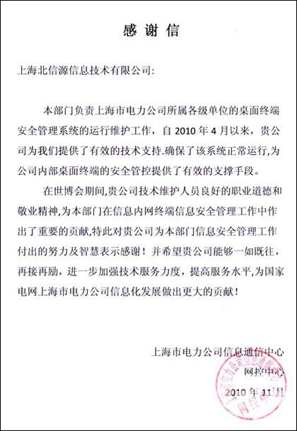 感謝信上書:“自2010年4月以來,貴公司為我們提供了有效的技術(shù)支持。確保該系統(tǒng)正常運(yùn)行,為公司內(nèi)部桌面終端的管控提供了有效的支撐手段。在世博會(huì)期間,貴公司技術(shù)維護(hù)人員良好的職業(yè)道德和敬業(yè)精神,為本部門在信息內(nèi)網(wǎng)終端信息安全管理工作中做出了重要貢獻(xiàn),特此對(duì)貴公司為本部門信息安全管理工作付出的努力及智慧表示感謝!”