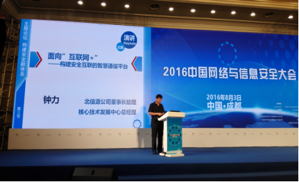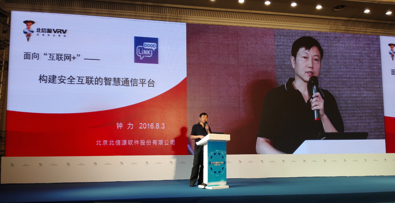 會(huì)上,北信源公司董事長(zhǎng)助理/核心技術(shù)發(fā)展中心總經(jīng)理鐘力博士作“面向’互聯(lián)網(wǎng)+’——構(gòu)建安全互聯(lián)的智慧通信平臺(tái)”主題演講。