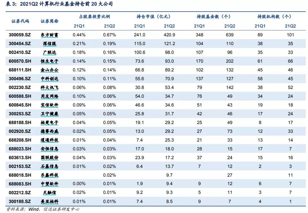 信達(dá)證券研報(bào)分析,計(jì)算機(jī)行業(yè)自2020年第二季度以來(lái),公募持倉(cāng)比例首次迎來(lái)回升,龍頭集中趨勢(shì)愈發(fā)顯著。