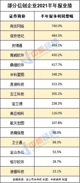 信創(chuàng)概念受追捧,相關(guān)公司業(yè)績(jī)實(shí)現(xiàn)大幅增長(zhǎng)。截至8月26日,在已公開半年報(bào)的熱門個(gè)股中,用友網(wǎng)絡(luò)凈利潤(rùn)同比增740%居首,信安世紀(jì)凈利潤(rùn)同比增484.3%緊隨其后。安博通、南威軟件、鼎捷軟件凈利潤(rùn)增幅超400%,中科星圖、麥迪科技、左江科技凈利潤(rùn)同比增超300%。寶蘭德凈利潤(rùn)同比增超200%,美亞柏科凈利潤(rùn)翻倍。