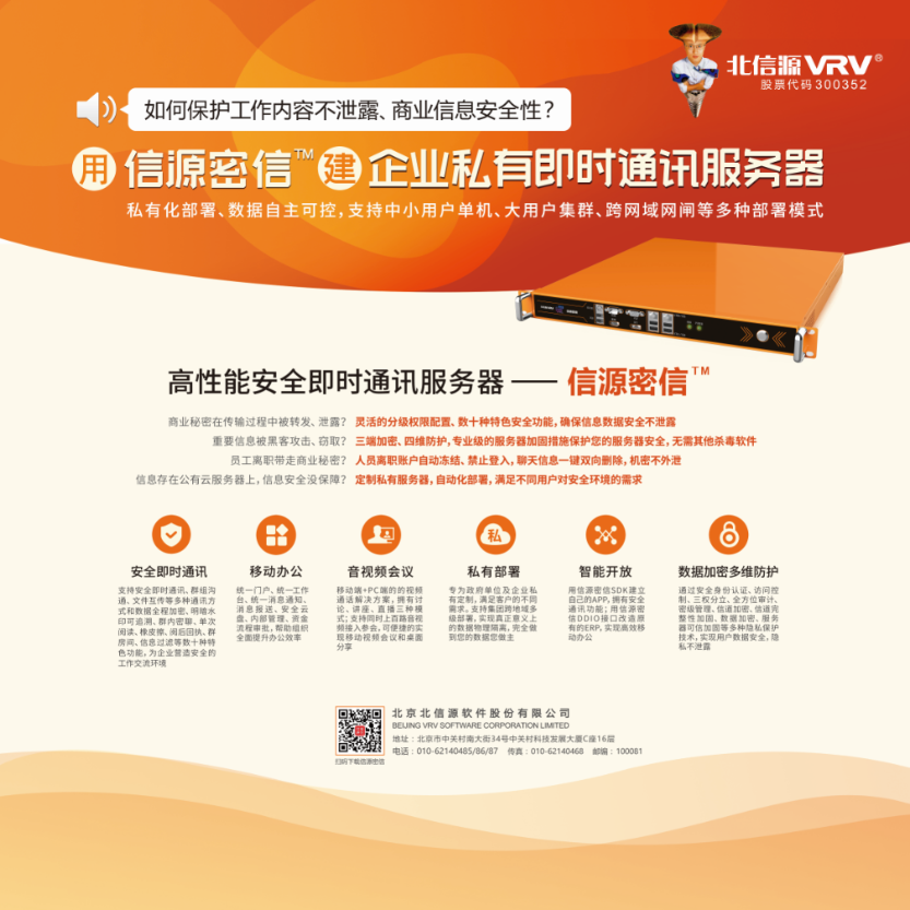 北信源作為持續12年中國信息安全龍頭企業,致力于為政府、行業客戶及廣大互聯網用戶提供5G時代下更安全、更智能、更便捷的自主可控安全生態體系和軟硬件一體化全方位解決方案。楊杰先生指出,公司目前業務方向主要布局信息安全及信創、移動辦公及安全通訊、社區管理及健康醫療三大領域。其中高性能安全即時通訊服務器——信源密信是公司全力打造的“安全即時通訊平臺”,可實現即時通訊、協同辦公、任務管理、應用開發等服務能力,幫助用戶快速開發三端加密,四維防護的創新應用定制系統,加強企業信息安全,避免使用通用的即時通訊工具帶來的數據泄漏風險。