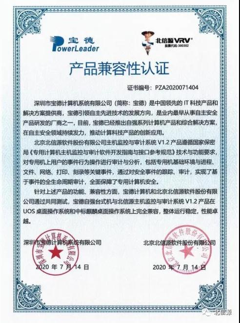 近日,北信源旗下兩款安全產品與深圳市寶德計算機系統有限公司旗下寶德自強系列服務器、臺式機等完成產品互認證,進一步擴大了創新安全生態圈。