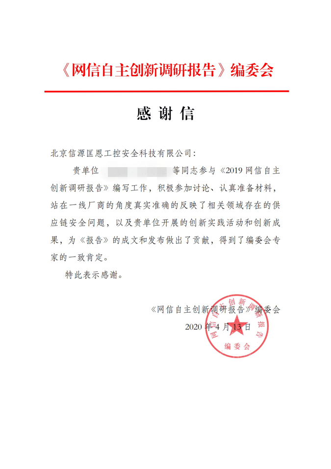 北信源作為信息安全行業領軍企業之一,多年在信息安全領域堅持技術創新,守護關鍵信息基礎設施安全,推出眾多產品、積累了豐富經驗,本次作為行業代表企業與子公司北京信源匡恩工控安全科技有限公司一起全程參與了本次報告的撰寫,并在編寫工作中積極參與、認真準備,獲得了編委會專家的一致肯定,并致信表揚信源匡恩公司技術骨干。