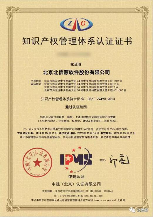 日前,北京北信源軟件股份有限公司正式通過國家“知識產權管理體系認證”,這也是繼信息安全風險評估三級服務資質認證、武器裝備質量管理體系認證之后公司在今年收獲的第三份認證證書,這標志著公司知識產權管理工作將進入規范化、系統化、科學化的新高度,有利于公司提升知識產權保護意識,促進技術創新,提升市場競爭地位和核心競爭力。