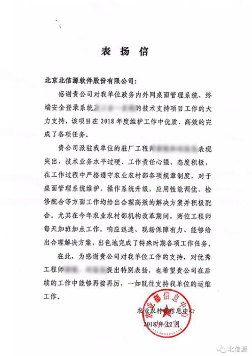 信中首先肯定了北信源在2018年的維護工作中優質、高效的完成了各項任務,同時強調,北信源駐場工程師技術業務水平過硬,工作責任心強、態度積極、嚴格遵守農業農村部各項規章制度,尤其在今年農業農村部機構改革期間,北信源工程師每天加班加點工作,響應迅速、現場保障有力、能夠及時給出合理解決方案,出色地完成了特殊時期各項工作任務,提出特別表揚!