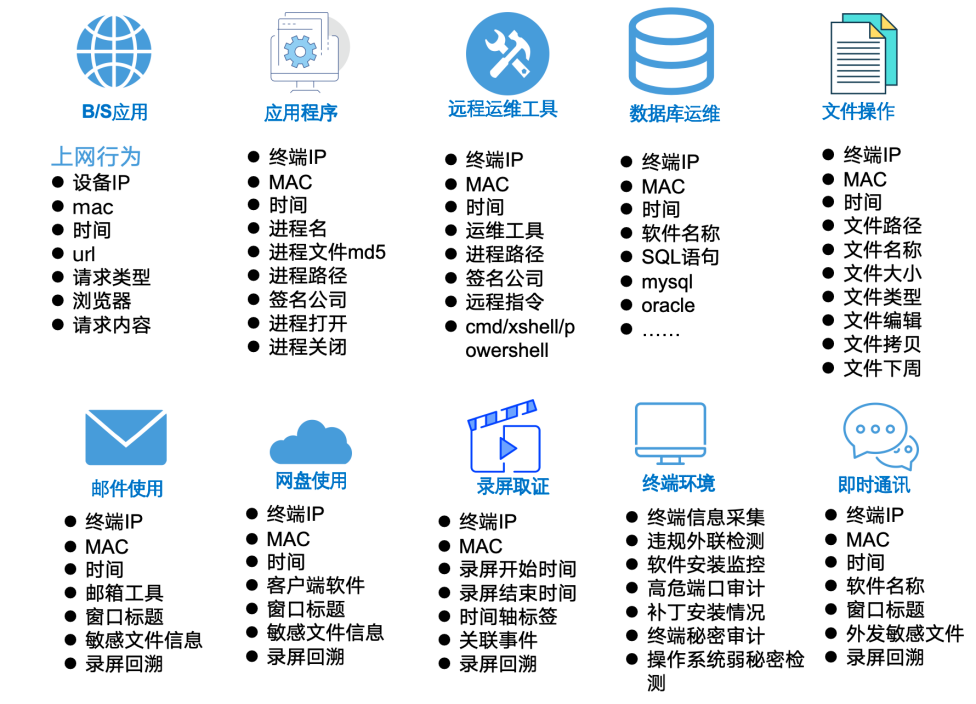 基于幾十種信息泄漏場(chǎng)景通過北信源終端代理程序?qū)K端行為進(jìn)行全面審計(jì),包括B/S應(yīng)用、應(yīng)用程序操作、文件操作、運(yùn)維工具操作、數(shù)據(jù)訪問工具操作、即時(shí)通訊等。