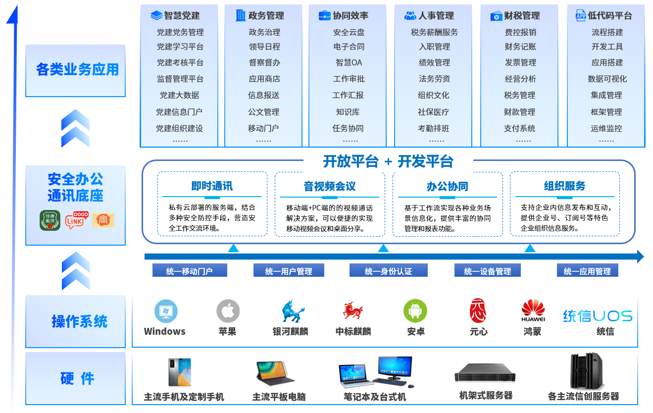 端:用戶使用的移動(dòng)終端。統(tǒng)一工作入口,提供基礎(chǔ)移動(dòng)應(yīng)用工作臺(tái),管控專用終端和自帶設(shè)備。